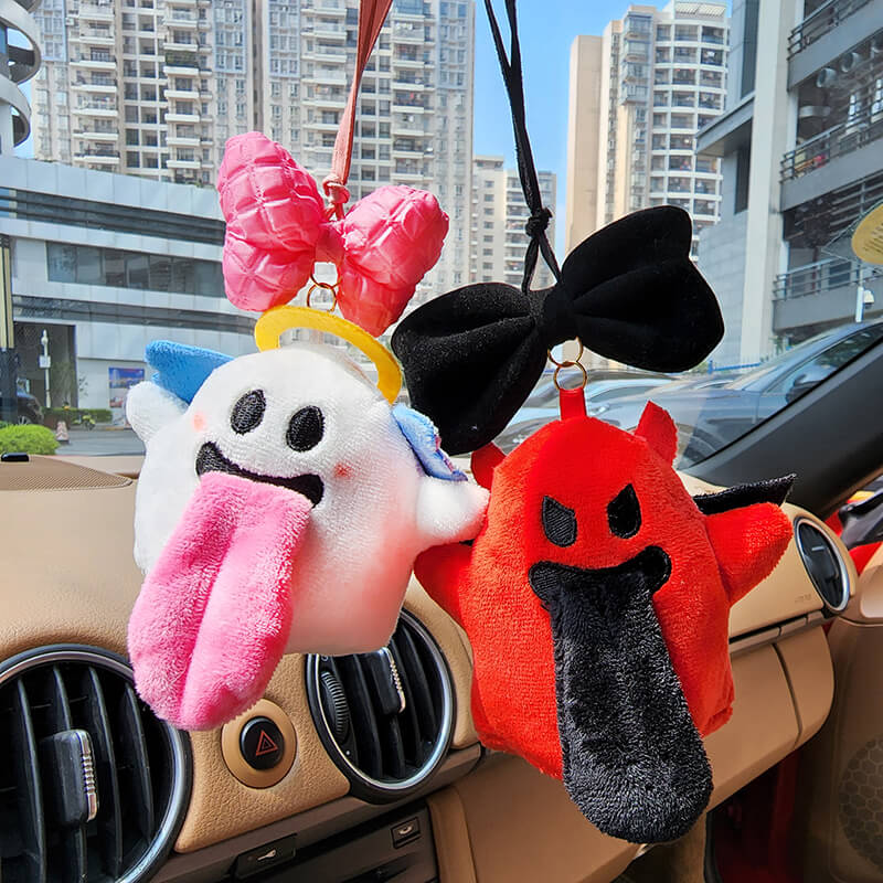 Add enchantment to your drive with the Angel & Devil Ghost Cute Plush Car Pendants + Seat Belt Cover Sets!